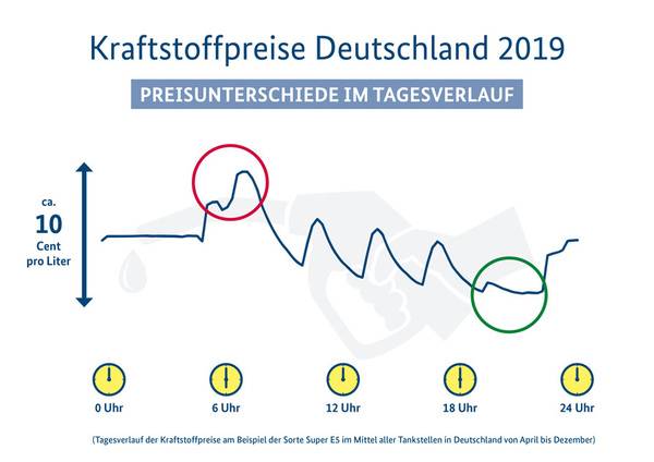 - Die Kraftstoffpreise sind weiterhin meist morgens (ca. 5 bis 8 Uhr) am höchsten und abends (ca. 18 bis 22 Uhr) am niedrigsten. Dazwischen schwanken die Preise im Schnitt durchaus erheblich. Gerade teurere Anbieter heben die Preise auch während der Niedrigpreisphase am Abend ab ca. 19 Uhr noch einmal an. Zur Nacht hin werden die Preise dann bei einem Großteil der Tankstellen, die noch geöffnet haben, wieder deutlich angehoben und bleiben nachts auch so hoch.