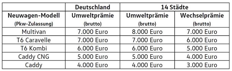 Die Umweltprämie wird deutschlandweit bei Verschrottung eines Euro-1- bis Euro-4-Dieselfahrzeugs – egal von welchem Hersteller – und Umstieg auf ein neues VWN-Modell mit Pkw-Zulassung angeboten. Die Prämienhöhe ist abhängig vom gewählten Neuwagen-Modell mit Pkw-Zulassung und Euro-6-Dieselmotor. Gewerbliche sowie private Fahrzeugbesitzer aus den 14 von der Bundesregierung klassifizierten Städten und angrenzenden Landkreisen mit besonders hohen Stickstoffdioxid-Werten können die Umweltprämie für Neuwagen mit Pkw-Zulassung aller Antriebsarten in Anspruch nehmen.