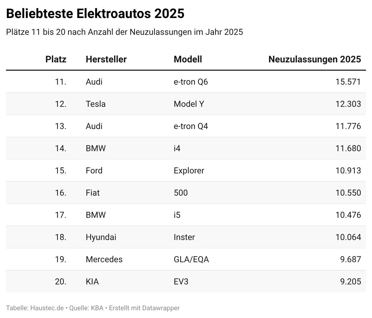 Und 2025? In diesem Jahr soll alles anders werden. Seit Juli wird wieder gefördert, jedoch profitieren davon nur Unternehmen mit einer großzügigen Abschreibungsregel. Doch bereits seit Jahresbeginn zeichnete sich die erneute Kehrtwende ab: Im ersten Halbjahr 2025 zählte das KBA bereits knapp 249.000. Neuzulassungen. Und diese Modelle führen die Hitliste an: