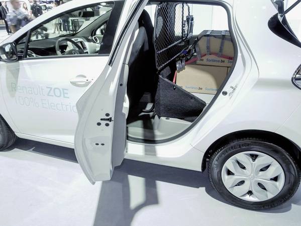 Der Renault Zoe stand auf der Nutzfahrzeugmesse nicht als Pkw, sondern in der Version Life mit Trenngitter und kleiner Ladefläche statt Rücksitzen. Mit einem 68 kW/92 PS starken Antrieb und Z.E.-40-Paket (Akkupaket mit 41 kWh) soll der frontgetriebene Serviceflitzer ab dem Frühjahr 2019 auf den Markt kommen.