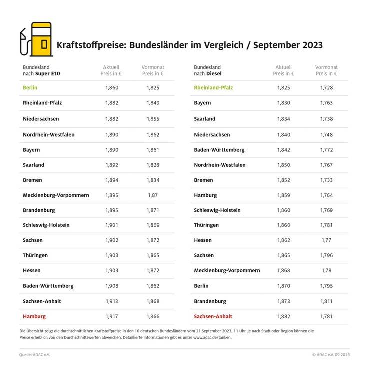 Für die Fahrer von Benziner-Pkw ist Berlin derzeit das günstigste Bundesland. Im bevölkerungsreichsten Stadtstaat kostet ein Liter Super E10 im Mittel 1,860 Euro. In Hamburg, zweitgrößter Stadtstaat in Deutschland, muss man für Benzin dagegen am tiefsten in die Tasche greifen: Ein Liter Super E10 kostet in der Hansestadt 1,917 Euro. Teuerstes Bundesland für Diesel ist Sachsen-Anhalt. Für einen Liter muss man dort 1,882 Euro bezahlen. In Rheinland-Pfalz kostet ein Liter des Selbstzünderkraftstoffs hingegen 1,825 Euro und damit 5,7 Cent weniger.