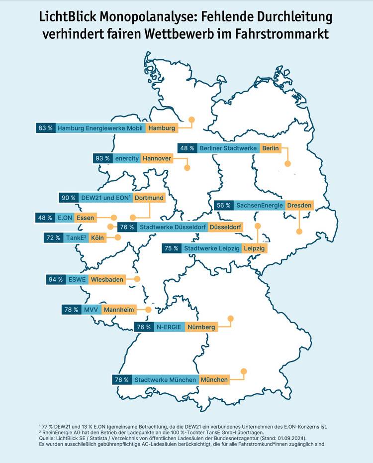 Obwohl der Ausbau der öffentlichen Ladeinfrastruktur weiter voranschreitet, dominieren weiterhin lokale Anbieter den regionalen Ladesäulenmarkt. Das zeigt die fünfte Monopolanalyse von LichtBlick. Im Schnitt beträgt der jeweilige Marktanteil 74 Prozent. Im Vergleich zur letzten Analyse stagniert die Entwicklung im Wesentlichen. In Wiesbaden (von 90 auf 94 Prozent), Hannover (von 91 auf 93 Prozent) und Köln (von 68 auf 72 Prozent) können die lokalen Monopolisten ihre Anteile im Vergleich zum Vorjahr sogar weiter ausbauen.
