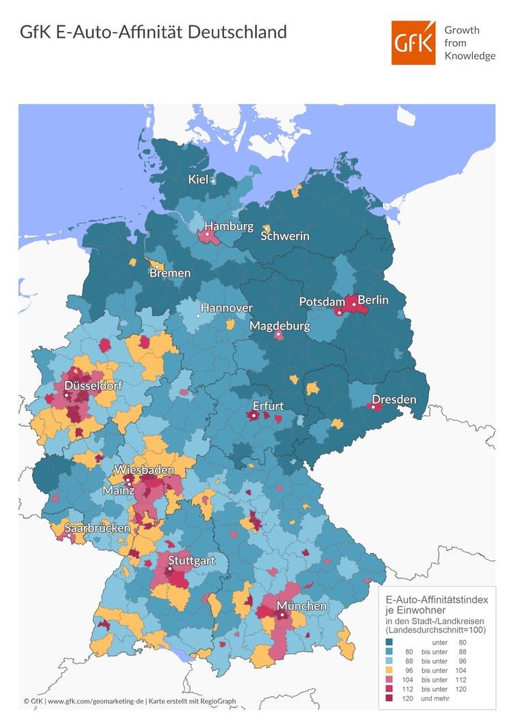 Die mit Abstand höchste Affinität zum Kauf von Elektroautos in Deutschland haben die Einwohner des Stadtkreises Weimar. Mit einem Indexwert von 213,1 liegen die Weimarer mehr als 113 Prozent über dem Bundesdurchschnitt. Auf den Rängen zwei und drei folgen die Stadtkreise Düsseldorf (Index 156,2) und München (Index 151,7). Das Schlusslicht bildet der Landkreis Lüchow-Dannenberg: Mit einem Indexwert von 68,8 liegt die Bevölkerung dort mehr als 31 Prozent unter dem Bundesdurchschnitt.