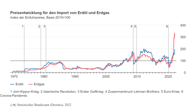 Wie in der aktuellen Lage waren auch in den Jahren 1973/74 hohe Preissteigerungen für Erdöl und Mineralölprodukte auf allen Wirtschaftsstufen zu verzeichnen. Im November 1973 stiegen die Einfuhrpreise für Erdöl gegenüber dem Vormonat Oktober um 41,6 %. Einen Monat zuvor hatte der Jom-Kippur-Krieg begonnen, der als Auslöser der ersten Ölkrise gilt. Die in der OPEC organisierten erdölexportierenden Staaten hatten damals ihre Fördermenge gedrosselt, um Druck auf westliche Staaten auszuüben. Im März 1974 war importiertes Erdöl schließlich mehr als drei Mal so teuer wie ein Jahr zuvor (+221,1 % gegenüber März 1973). Die Preise für die daraus im Inland erzeugten Mineralölprodukte hatten bereits im Februar 1974 ihre bis dahin höchste Vorjahresveränderungsrate erreicht (+68,9 % gegenüber Februar 1973).