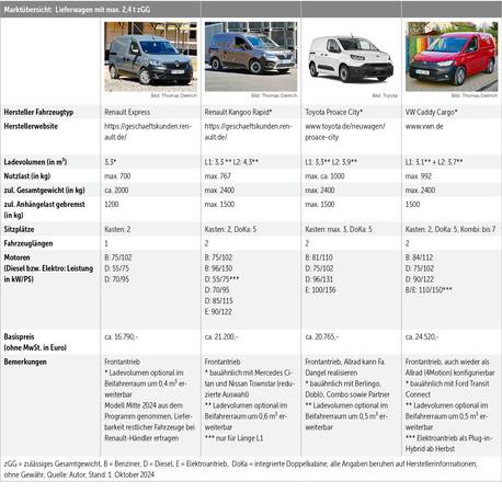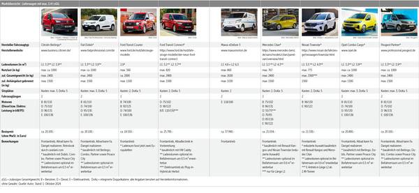 Über Jahre hinweg haben etliche Hersteller ihr Lieferwagenangebot mit sogenannten Mikro-Vans nach unten abgerundet. Dazu gehörten z. B. Renault Kangoo Compact oder Citroën Nemo bzw. Peugeot Bipper – für die es nur noch Ersatzteile gibt. Von diesen Kleinfahrzeugen übrig geblieben ist der noch erhältliche Fiat Fiorino mit 2,5 m3 hinter der Trennwand. Wegen der geringen Größe findet er in dieser Übersicht keine Berücksichtigung – im Gegensatz zum Ford Courier, der inzwischen im Raumangebot zugelegt hat.