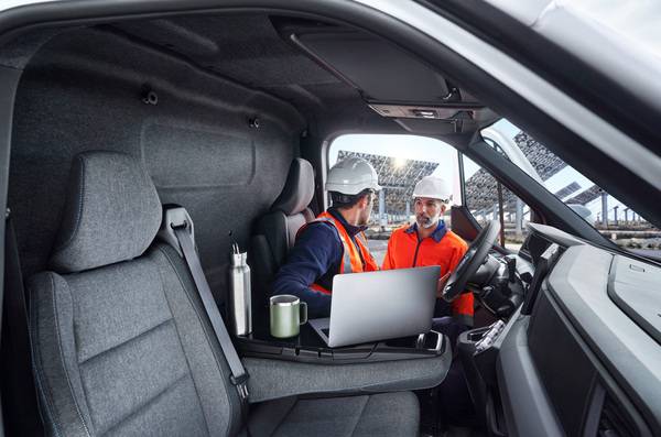 Über Steckdosen im Cockpit und im Laderaum können sowohl Elektrowerkzeuge oder beispielsweise ein Computer 230 Volt Netzspannung bekommen. Das neuentwickelte Instrumentenboard mit 10-Zoll-Bildschirm setzt der Konnektivität für digitale Dienste kaum Grenzen.