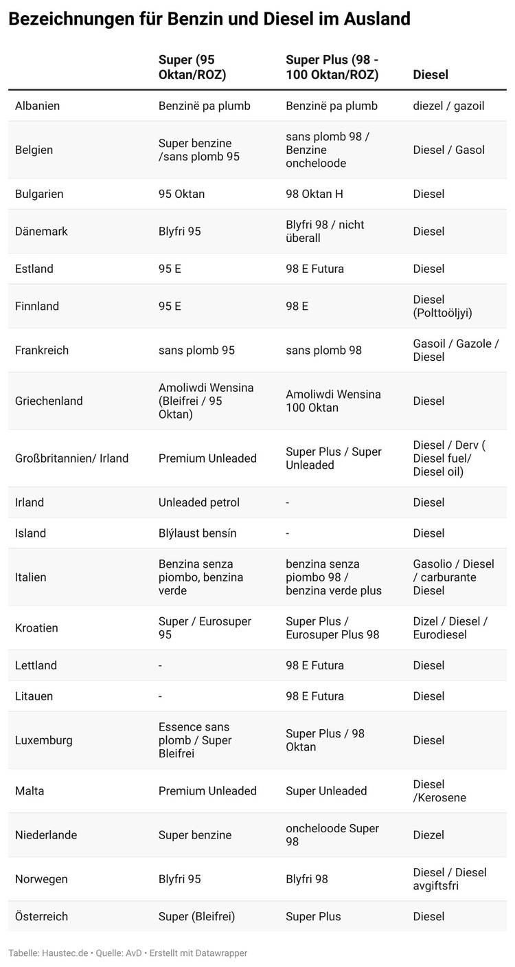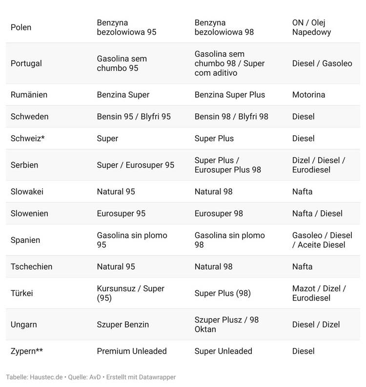 Viele Deutsche fahren in ihrem jährlichen Sommerurlaub ins europäische Ausland - meist mit dem Auto. Nach einer längeren Anfahrt und auch bei vielen Ausflügen vor Ort führt jedoch kein Weg daran vorbei, im Ausland tanken zu müssen. Doch an der Tanksäule ist das Heulen und Zähneklappern oft groß: Welcher Sprit mit welchem Namen gehört in meinen Tank?