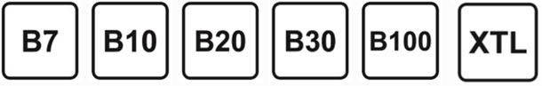 Dieselartige Kraftstoffe: Sie sind erkennbar am Quadrat. Die Buchstabenkombination im Inneren bezeichnet den Anteil des Biodiesels („B“ steht für spezifische Biodieselkomponenten im Diesel). Die Zahl dahinter zeigt wieviel Biodiesel enthalten ist, beispielsweise B7 enthält 7 Prozent Biodiesel, B100 besteht zu 100 Prozent aus Biodiesel.