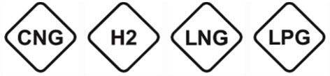 Gasförmige Kraftstoffe: Sie werden mit einer Raute gekennzeichnet. Zu ihnen zählen CNG (Compressed Natural Gas, also Erdgas), LNG (Liquefied Natural Gas, also Flüssiggas), LPG (Liquefied Petroleum Gas, also Autogas) und Wasserstoff.
