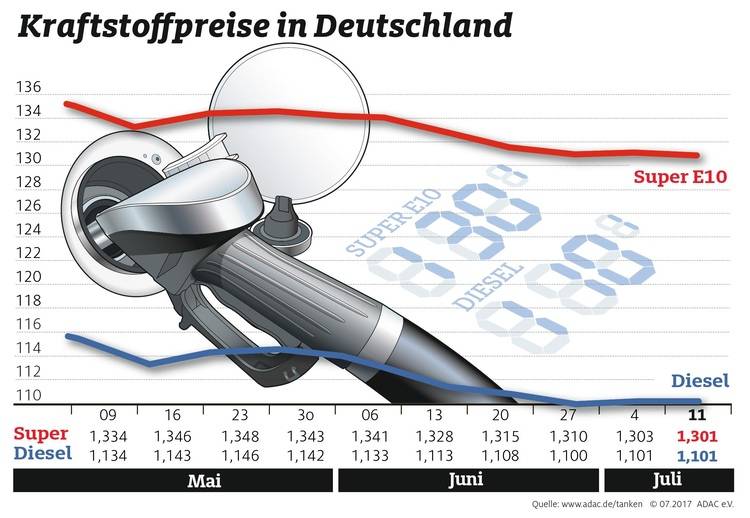 Die Kraftstoffpreise verharren auf günstigem Niveau. Der Preis für einen Liter Super E10 gab im Vergleich zur Vorwoche leicht nach und liegt nach Angaben des ADAC derzeit im bundesweiten Mittel bei 1,301 Euro. Der Preis für einen Liter Diesel blieb unverändert bei 1,101 Euro.