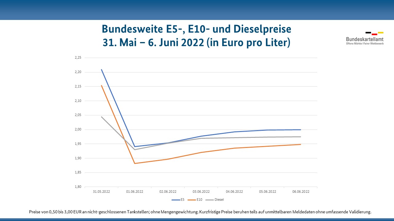 "Mit der Einführung der Steuerermäßigung ist der Preis für E5 und E10 zunächst um 27 Cent und der Preis für Diesel um 11 Cent im Durchschnitt gefallen. Seitdem sind die Preise wieder leicht, um ca. 5-6 Cent im Durchschnitt angestiegen. Wie das sich zum Verlauf des Ölpreises und anderer Marktindikatoren verhält, werden wir im Laufe dieser Woche auswerten", erklärt Andreas Mundt, Präsident des Bundeskartellamtes.