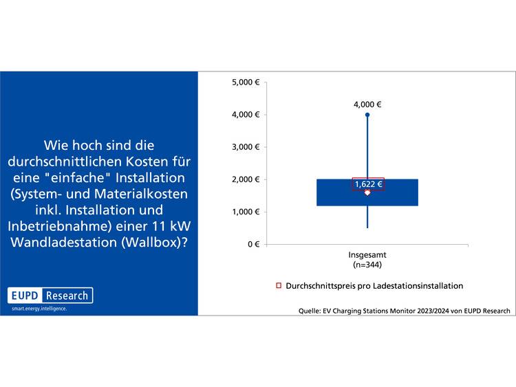 Im Durchschnitt liegen die Kosten mit 1.622 € deutlich höher. Der Hauptgrund für diese Entwicklung ist, dass sich moderne Ladestationen immer weiter ausdifferenzieren. Einfache Wallboxen ohne Zusatzfunktionen wie solares Laden, Energiemanagement und weitere Funktionalitäten können zu deutlich günstigeren Preisen angeboten werden. In der Spitze gaben die befragten Installateure an, bis zu 4.000 € für eine Installation zu verlangen.