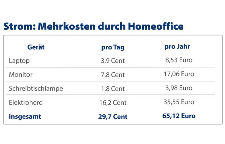 Verbraucher, die Corona-bedingt ein ganzes Jahr lang von zu Hause aus arbeiten, zahlen dafür rund 65 Euro mehr für Strom. Am Tag entstehen durch den Betrieb von Laptop, Monitor, Schreibtischlampe und die Nutzung des Elektroherds Mehrkosten von rund 0,30 Euro. Auf die 120 Tage gerechnet, die als Grundlage für die Homeoffice-Pauschale dienen, zahlt ein Arbeitnehmer 36 Euro mehr für Strom. Das Laden eines Smartphones spielt für die Mehrkosten im Homeoffice keine Rolle. Denn pro Ladevorgang werden lediglich 0,3 Cent fällig.