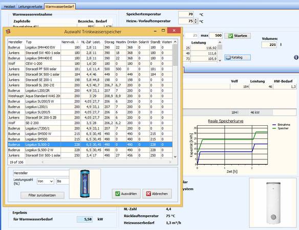 Fakten zur Auslegung von Kesseln und Speichern: das Produkt „HS DIM-PLAN 3D“ steht für die Dimensionierungsplanung und wurde primär zur Auslegung von Trinkwarmwasser und Pufferspeicher entwickelt. Die Auslegung des passenden Speichers ist dabei ein wesentlicher Punkt für die Effizienz der Anlage. Durch individuell erstellbare Verbräuche und Zapfzeiten, sowie einem detailliert aufgeschlüsselten Wärmeschaubild können auch hier sehr viele Speicher geprüft und passend ausgelegt werden.