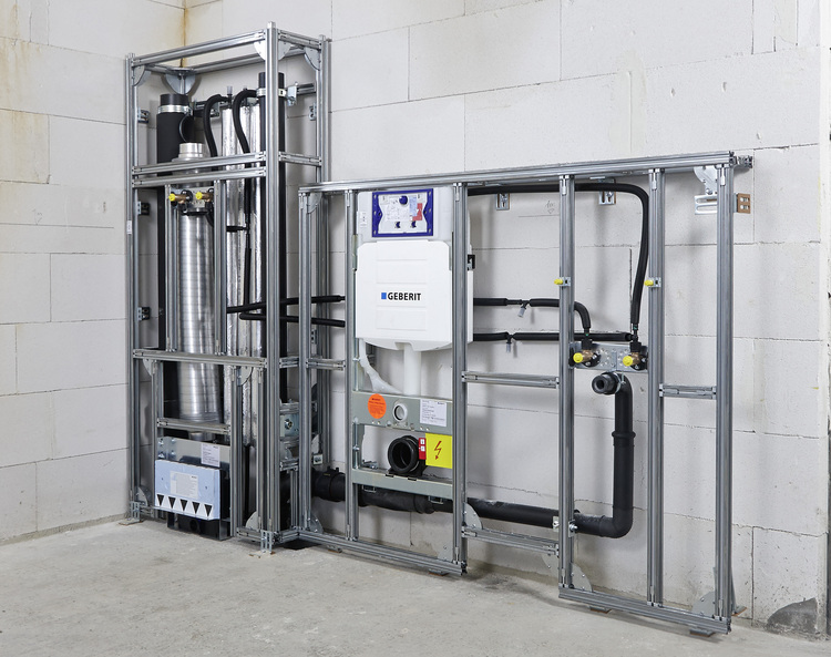 Die Präzision der Werksmontage und die ausschließliche Verwendung von Geberit Produkten erhöhen außerdem die Qualität der Sanitärinstallation. Alle Komponenten sind aufeinander abgestimmt und für den gemeinsamen Einsatz zugelassen. Statt Einzelteilen erhält der Auftraggeber ein Gesamtprodukt, das alle baurelevanten Auflagen – auch zu Schall- und Brandschutz – bereits erfüllt. Der oft hohe Aufwand für die Zulassung von Einzelkomponenten entfällt. Besonders wirtschaftlich und platzsparend lassen sich Brandschutzanforderungen umsetzen, denn die Versorgungs- und Abwasserrohre dürfen auf Nullabstand montiert werden. Im Wohnungsbau ist das ein klarer Vorteil: Je enger die Rohre beieinander montiert werden können, desto kleiner sind die Technikschächte.