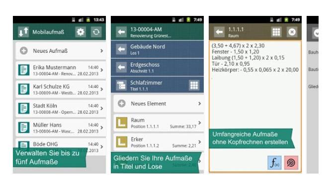 Mit der Aufmaß-App Mobilaufmaß erfassen Sie Aufmaße auf der Baustelle und sparen Zeit. Es lässt sich im Handumdrehen ein hierarchisch aufgebautes Aufmaß mit Titeln, Losen und Positionen erstellen. Die Benutzerführung ist intuitiv und praxisorientiert. Auch komplexe Raumberechnungen erledigen Sie mit der integrierten Formelsammlung ganz nebenbei. Außerdem können neuere digitale Lasermessgeräte über die Aufmaß-App drahtlos angebunden werden.