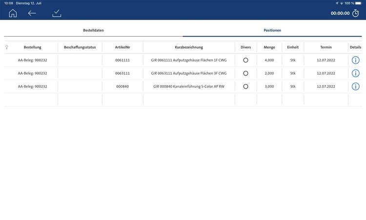 Sind alle Artikel gefunden, werden diese mit wenigen Klicks bestellt. Die App zeigt die Positionen inklusive Artikelnummer, Kurzbezeichnung und Preis. Der Mitarbeiter kann zudem den Lieferort sowie den gewünschten Liefertermin festlegen und weitere Bemerkungen hinzufügen.