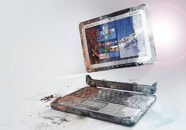 - Fully-Rugged-Hardware ist nahezu vollständig gegen äußere mechanische oder klimatische Einflüsse abgeschottet und hat keinen Lüfter. Sie ist nach IP65 staub- und strahlwasserdicht sowie nach den jeweiligen MIL-Standards (MIL-STD 810F, 810G, 461F etc.) getestet und zertifiziert. Stürze aus Hüfthöhe werden auch in aufgeklapptem Zustand klaglos hingenommen, ebenso wie extreme Temperaturen (– 20 bis + 60 °C).
