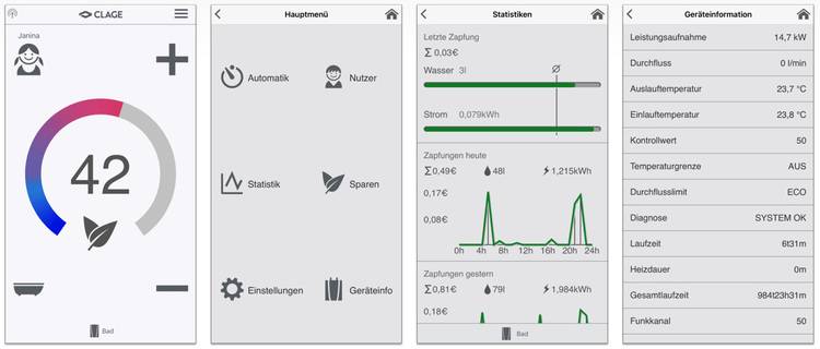 Die Smart Control App ermöglicht zusammen mit dem Clage Home Server die komfortable Temperatursteuerung der elektronischen Durchlauferhitzer von Clage. Die App für Smartphones und Tablets bietet eine intuitiv zu bedienende Benutzeroberfläche zum Einstellen der gewünschten Wassertemperaturen im Badezimmer. Detaillierte Auswertungen des Energie- und Wasserverbrauches ermöglichen Kostentransparenz und Anpassungen des Nutzerverhaltens. Die Temperatur wird über einen farbigen Skalenring eingestellt. Es können bis zu acht verschiedene Nutzerprofile angelegt werden.