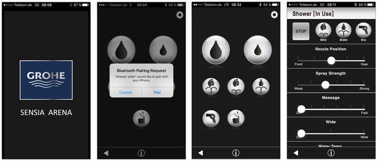 Diese App steuert die Funktionen des Dusch-WCs Sensia Arena von Grohe und kann die gewählten Einstellungen in individuellen Nutzerprofilen speichern. Ein Profil beinhaltet die Strahlart, die Position des Duscharms, den Wasserdruck und die Temperatur, auch Föhn und Geruchsabsaugung lassen sich programmieren.