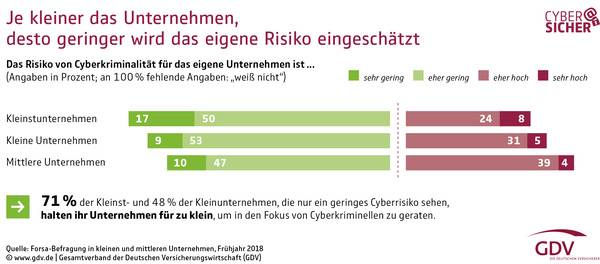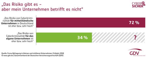 Weitere Ergebnisse der Untersuchung: Je kleiner die Unternehmen, desto besser fühlen sie sich geschützt – doch desto häufiger sind sie Opfer von Cyberangriffen. Und bei der Datenschutzgrundverordnung sind über die Hälfte der Mittelständler noch völlig planlos. Grundlage der Studie der GDV-Initiative „CyberSicher“ ist eine repräsentative Forsa-Befragung von 300 Entscheidern in kleinen und mittleren Unternehmen.