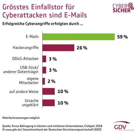 „Bei der IT-Sicherheit kommt es eben nicht nur auf Technik an. Auch Mitarbeiter müssen für die zahlreichen Gefahren sensibilisiert werden“, sagt Peter Graß, Cyberversicherungsexperte des GDV. Nur bei jedem vierten Angriff (26%) drangen Hacker über die Netzwerk-Systeme ein. Sogenannte Ddos-Attacken oder Schädlinge auf Datenträgern wie USB-Sticks (jeweils 3%) spielen kaum eine Rolle.