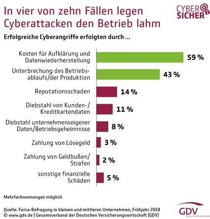 Am häufigsten mussten Betriebe nach einem Angriff Kosten für die Aufklärung und Datenwiederherstellung in Kauf nehmen (59%). In vier von zehn Fällen (43%) legten die Angriffe die betroffenen Firmen sogar zeitweise lahm. „IT-Aufklärung, Datenwiederherstellung und besonders die Betriebsunterbrechung geht für Unternehmer sofort ins Geld. Deshalb macht es auch für kleine Betriebe Sinn, sich mit einer Cyberversicherung abzusichern“, sagt Graß.