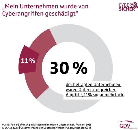 Gerade im Mittelstand nimmt das Problem von Internet-Angriffen immer mehr zu: Insgesamt haben 30% der kleinen und mittleren Unternehmen in Deutschland bereits Schäden durch Cyberangriffe erlitten, jeder zehnte Betrieb (11%) sogar bereits mehrfach. Drei Viertel der Angriffe (74%) haben sich erst in den vergangenen zwei Jahren ereignet.