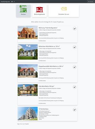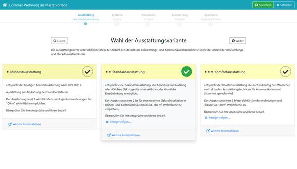 Zu Beginn wird aus den Vorlagen ein passendes Projekt ausgewählt. Dabei wird zwischen Neubau und Bestandsgebäuden unterschieden. Anschließend wird die gewünschte Ausstattungsvariante festgelegt. Die Ausstattungswerte unterscheiden sich unter anderem in der Anzahl der Steckdosen, der Beleuchtungs- und Kommunikationsanschlüsse sowie der Anzahl der Beleuchtungs- und Steckdosenstromkreise.