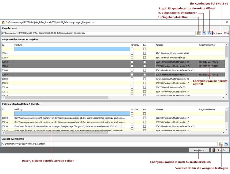 Die Objekt- und Verbrauchsdaten können bequem in einer MS Exceltabelle o.ä erfasst, in ein lesbares Format konvertiert und in die Software importiert werden. Die Software prüft die Daten auf Vollständigkeit, Einhaltung der EnEV-Bestimmungen und Plausibilität. Die Daten werden übersichtlich in einer Maske dargestellt. Für ungültige bzw. nicht plausible Datensätze werden entsprechende Meldungen angezeigt. Anhand dieser Meldungen kann der Aussteller die Daten direkt korrigieren und in der Software aktualisieren.