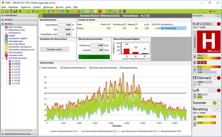 Envisys bietet damit ein weiteres Modul „EVEBI – Sommerlicher Wärmeschutz Simulation“ für die Energieberatersoftware EVEBI an. Berechnet werden die Übertemperaturstunden (Anzahl der Stunden und Kelvin über der maximal erlaubten Raumtemperatur) sowie deren Überschreitungshäufigkeit in Stunden mit überhöhten Raumtemperaturen. Die Berechnung erfolgt gemäß DIN 4108-2 in Anlehnung an die DIN EN ISO 13791.