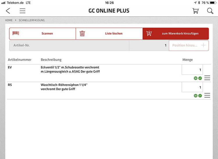 Die GC App ermöglicht dem Fachhandwerker Artikelnummern, Werksnummern oder GTIN samt Mengen direkt einzugeben, auch wenn er nicht im System angemeldet ist. Sämtliche Daten werden in diesem Fall lokal auf seinem Gerät gespeichert. Erst, wenn der Fachhandwerker die erfassten Artikel in den Warenkorb legen möchte, fordert GC Online Plus eine Anmeldung an und fragt nach dem gewünschten Warenkorb. Ist er schließlich angemeldet, überprüft das System die Daten auf ihre Korrektheit und meldet automatisch mögliche Fehler. Ist die Artikel-Nummer korrekt, ist das Produkt verfügbar? Das alles wird nahtlos angezeigt, ganz ohne Pop-ups oder andere zeitliche Hindernisse.