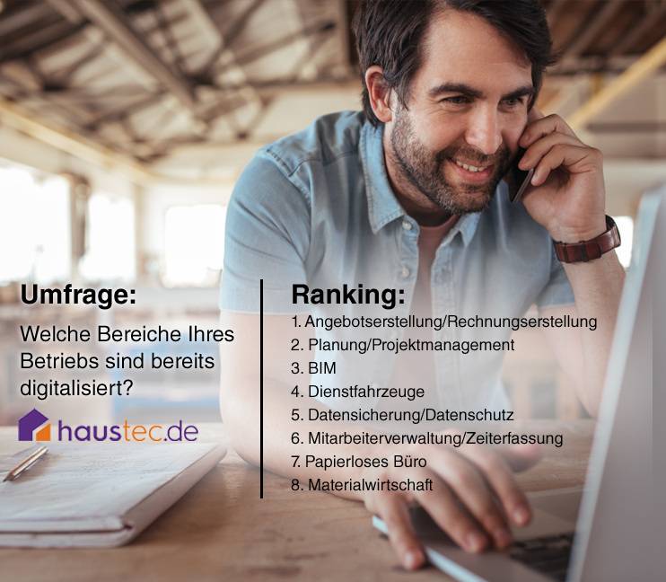 Der Bereich Angebotserstellung bzw. Rechnungserstellung ist bei 25 Prozent der Umfrageteilnehmer bereits digital. 14 Prozent greifen bei der Planung und dem Projektmanagement auf digitale Lösungen zurück. Ebenfalls 14 Prozent nutzen digitale Tools wie etwa Building Information Modeling (BIM). Diese Bereiche belegen die ersten drei Plätze in unserem Ranking.