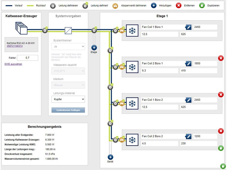 Das Tool ermöglicht es auch, Geräte zu duplizieren, wenn identische Geräte in verschiedenen Räumen oder Etagen eingesetzt werden sollen. Es lässt sich auch eine komplette Etage duplizieren. Am Ende der Eingaben erhält der Heizungsbauer ein visuelles Schema seiner Anlage.