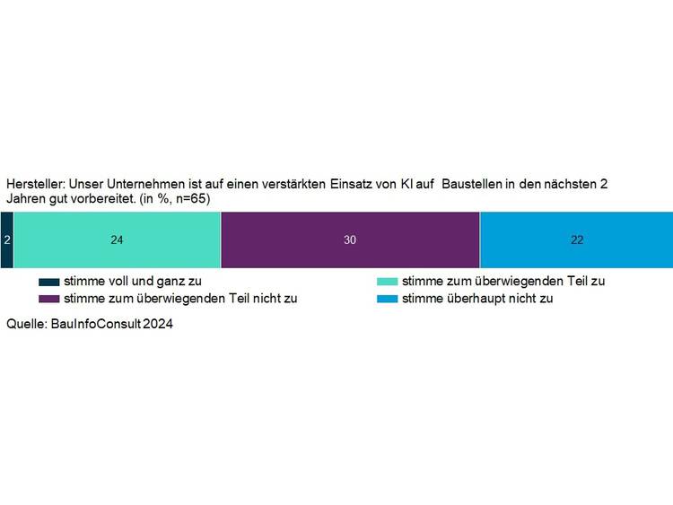 Umso erstaunlicher ist es, dass die meisten Hersteller in Bezug auf das eigene Unternehmen verneinen müssen, bereits auf den verstärkten Bau-KI-Einsatz binnen zwei Jahren vorbereitet zu sein. So muss jeder zweite Betrieb einräumen, zum überwiegenden Teil oder überhaupt nicht auf den verstärkten Einsatz von KI in der Branche vorbereitet zu sein. Ein Viertel der Befragten nimmt immerhin großteils für die eigene Firma in Anspruch, dass KI-Konformität intern bereits in den Startlöchern steht.