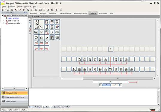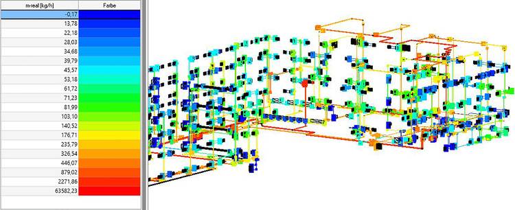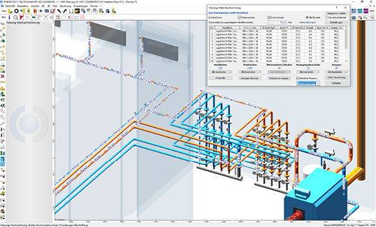 Werden Heizkörper hinzugefügt oder entfernt, öffnet bzw. schließt die Planungssoftware für die Heizung die Leitungsstränge selbstständig. Nachdem die Leitungsführung im Gebäude vorgegeben und die Heizkörper automatisch angebunden wurden, legt die Software das Rohrnetz entsprechend der Massenströme aus. Randbedingungen sind dabei die maximale Strömungsgeschwindigkeit und der materialabhängige Rohrreibungswiderstand (R-Wert).