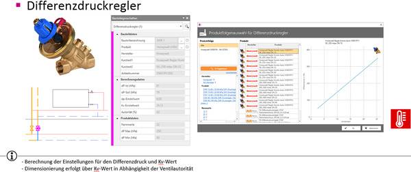 Mit den Dimensionierungsvorgaben, dem aus der Trassenführung und der Heizflächenauslegung jeder Teilstrecke zugeordneten Massenstrom, berechnet die Software unter Berücksichtigung von Ventildaten (kv-Werte) und formstückabhängigen Widerstandsbeiwerten (Zeta-Werte) folgende Punkte: