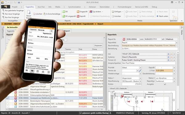 Der Vorteil liegt in der Integration: Projektdaten wie beteiligte Firmen und Personen oder Leistungen und Termine müssen nicht mehrfach eingegeben werden – das jeweilige Basisprogramm übernimmt sie direkt. Umgekehrt können Baustellendokumentationen durchgängig in anderen Modulen weiterverarbeitet werden, etwa bei der Bauzeitenplanung oder im Projektcontrolling. Außerdem müssen sich die Anwender nicht ständig an andere Benutzeroberflächen gewöhnen. Auch hier lässt sich durch eine App bzw. Software deutlich an Zeit auf dem Bau einsparen.
