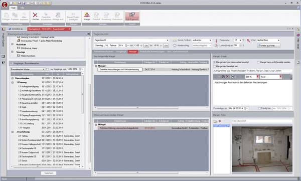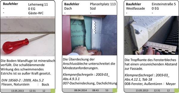 Da bei der Mängelverfolgung und bei Bautagebüchern oder Bautagesberichten rechtliche Aspekte zu beachten sind, unterstützt eine App bzw. Software Anwender auch beim Erstellen rechtssicherer Unterlagen oder beim Verfolgen von Fristen. Neben Dokumentationsfotos lassen sich Informationen wie gescannte Pläne, Planausschnitte oder Dokumente direkt einbinden, meist auch Sprachnotizen oder Videosequenzen. Von Vorteil ist, wenn Fotos wenigstens in einfacher Form bearbeitet (Größe, Ausschnitt ändern etc.) und mit Hinweispfeilen, Maßen und Bildkommentaren ergänzt werden können. Wertet die Software GPS-Daten der mobilen Hardware aus, können die Fotos direkt verortet werden.