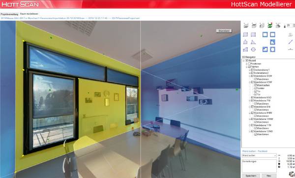 Das Tool kann auch bei der Berechnung von Raumkanten unterstützen - und sogar diejenigen erfassen, die hinter Bauteilen verborgen liegen. Kein Maß wird dadurch in Zukunft verloren gehen. Aus den Messwerten werden mit Hilfe von Ebenen und Flächen zügig vollständige 3D-Räume modelliert. Sobald die Boden- und Deckenflächen konstruiert sind, werden fehlende Bauteile auf Knopfdruck ergänzt. Komplete Gebäude und einzelne Gebäudeebenen können für weiterführende Planungen mittels der Software HottScan Projects generiert werden.