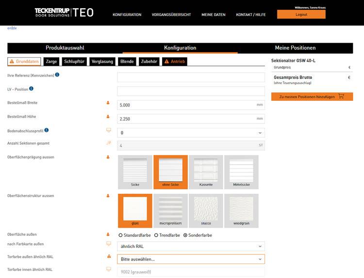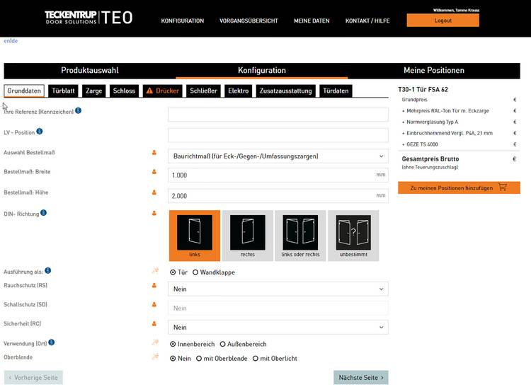 Der intuitiv bedienbare Konfigurator "TEO Teckentrup einfach online" sorgt dafür, dass Türen und Tore widerspruchsfrei geplant und kein relevantes Detail vergessen wird. Fehler – z.B. eine nicht zugelassene Drückergarnitur bei einer Feuerschutztür – sind so ausgeschlossen. Der Konfigurator soll genau auf die Bedürfnisse der Profis zugeschnitten sein. Das umfasst den Aufbau im Ganzen und reicht bis zu den Details – zum Beispiel die Option, die Auswahl „Rechts-/Links-Tür“ erst später zu treffen, die weiteren Daten aber schon komplett zu hinterlegen, um so früh einen Angebotspreis für die fertigen Türen und Tore ermitteln zu können.