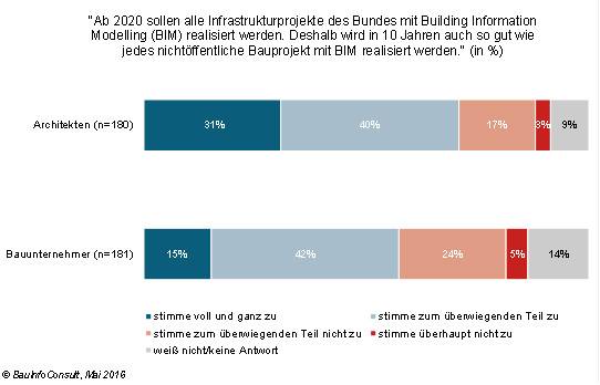 Denn so schön die Pläne zu BIM auch klingen mögen: Wichtig ist, wie die Architekten und Verarbeiter über dieses Thema denken, denn schließlich sind sie es, die mit der Umsetzung betraut werden. Im Rahmen der letzten Jahresanalyse von BauInfoConsult wurden 180 Architekten und 181 Bauunternehmer in telefonischen Interviews nach ihrer Einschätzung für den langfristigen Erfolg des öffentlichen BIM-Engagements befragt.