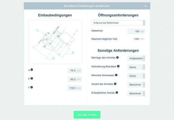 Basierend auf den Angaben sucht das Tool Antriebe aus der Produktdatenbank heraus, die dem Bauvorhaben bestmöglich entsprechen. In Form einer Empfehlung fasst das System alle Anforderungen und Antriebsdaten übersichtlich zusammen. Auch Datenblätter, technische Zeichnungen und Anleitungen stehen zum Download bereit. In einem letzten Schritt können Interessierte ein konkretes Angebot beim Unternehmen anfordern. Alternativ lassen sich die Informationen zunächst auch in Form einer PDF abspeichern.