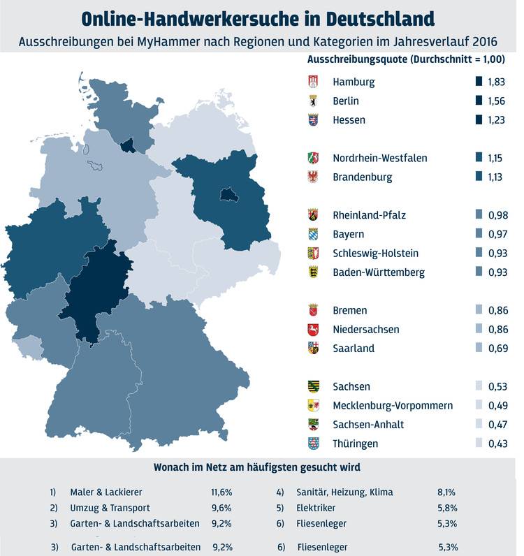 In weiten Teilen Ostdeutschlands ist die Onlinesuche nach Handwerkern dagegen bislang deutlich weniger verbreitet. So werden in den ostdeutschen Flächenländern – mit Ausnahme der hauptstadtnah gelegenen Regionen Brandenburgs – oft nur halb so viele Handwerkeraufträge im Netz ausgeschrieben wie in den westdeutschen Bundesländern.