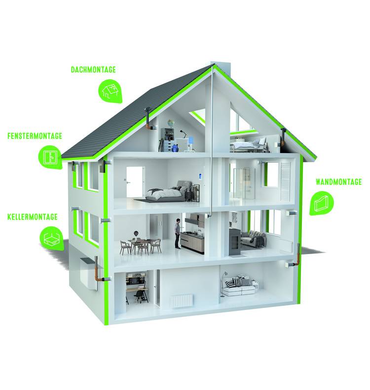 Das Zubehör-Sortiment eröffnet Lösungsansätze für eine kontrollierte Wohnraumlüftung im gesamten Gebäude – von Dachstuhl über Laibungslösungen bis zum Kellerbereich. Für die Abluftbereiche Küche und Bad bietet Leaf Ventilation zusätzliche Ventilatoren an, die Feuchtigkeit und Gerüche nach außen transportieren.