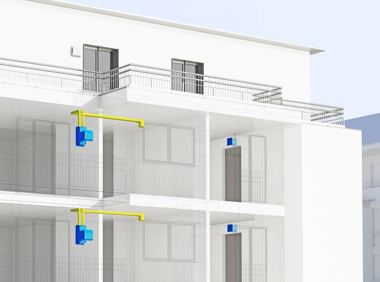 Ablufträume werden direkt an das Außenwand-Lüftungsgerät freeAir 100 von bluMartin angeschlossen. Weitere Räume bindet der aktive Überströmer freeAir plus ganz ohne Lüftungsleitungen an die Wohnraumlüftung an. Das vereinfacht die Planung. Dank Rohbaukomponenten gestalten sich auch Installation und Inbetriebnahme einfach.
