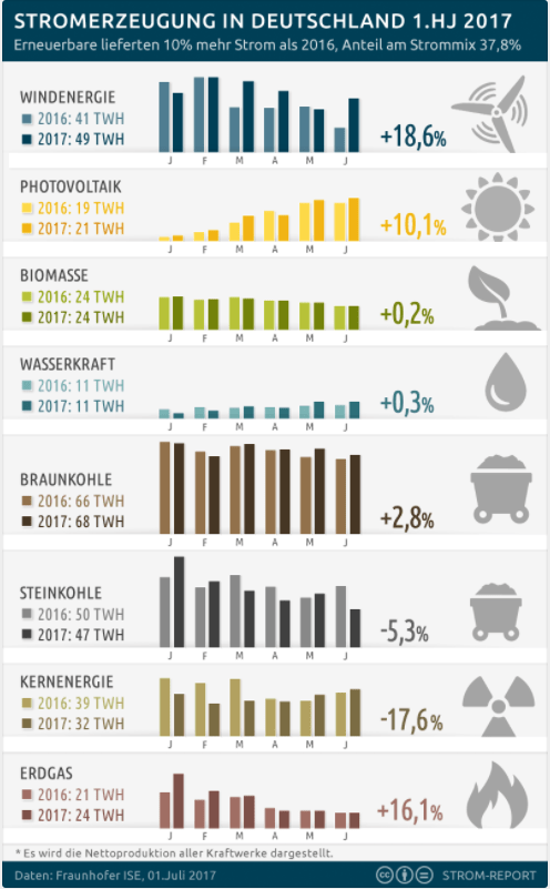 Das geht aus den Bericht "Stromerzeugung in Deutschland im ersten Halbjahr 2017" des Fraunhofer Instituts für Solare Energiesysteme ISE hervor.