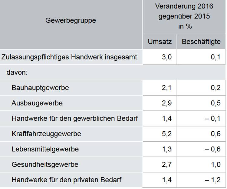 Im Jahr 2016 stiegen die im Rahmen der Umsatzsteuervoranmeldung gemeldeten Umsätze im zulassungspflichtigen Handwerk um 3,0% gegenüber dem Jahr 2015. Dies teilt das Statistische Bundesamt (Destatis) anhand vorläufiger Ergebnisse anlässlich der Internationalen Handwerksmesse in München mit. Die jahresdurchschnittliche Zahl der im zulassungspflichtigen Handwerk Beschäftigten stieg im Jahr 2016 im Vergleich zum Vorjahr um 0,1%.