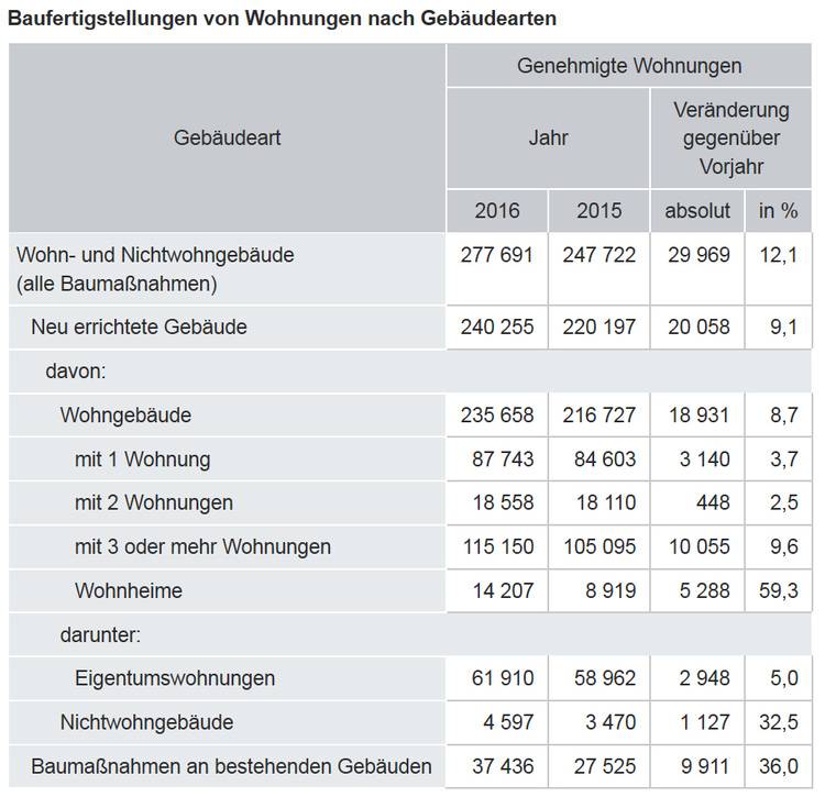 Von den im Jahr 2016 fertiggestellten Wohnungen waren 235.700 Neubauwohnungen in Wohngebäuden (+8,7% gegenüber 2015). Dieser Anstieg resultierte insbesondere aus der Fertigstellung von Wohnungen in Mehrfamilienhäusern (+9,6% beziehungsweise +10.100 Wohnungen) sowie in Wohnheimen (+59,3% beziehungsweise +5300 Wohnungen). Zur Kategorie Wohnheime zählen unter anderem Flüchtlingsunterkünfte. Die Fertigstellungen von Wohnungen in Einfamilienhäusern stiegen um 3,7% bzw. 3100 Wohnungen und in Zweifamilienhäusern um 2,5% beziehungsweise 400 Wohnungen. Erheblich zugenommen haben die durch Baumaßnahmen an bestehenden Gebäuden fertig gestellten Wohnungen (+ 36,0% beziehungsweise +9900 Wohnungen).