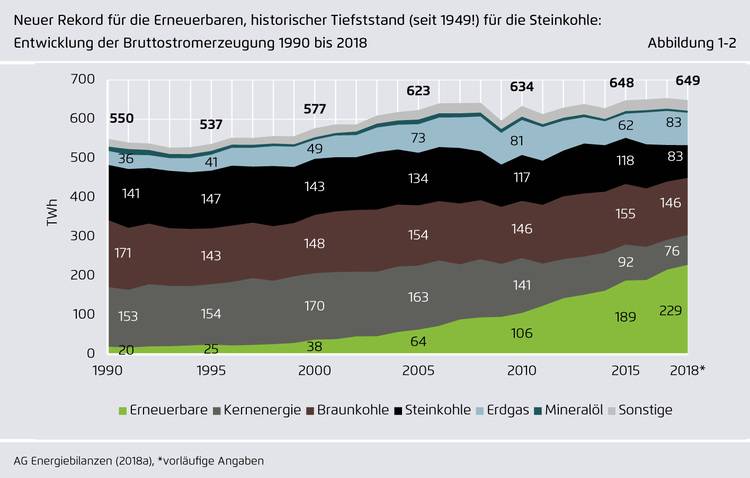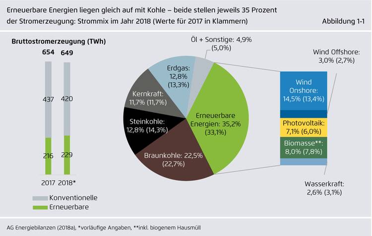 Im Jahr 2018 stammte in Deutschland erstmals genauso viel Strom aus Erneuerbaren Energien wie aus Kohle: Jeweils 35,2% der Stromerzeugung entfielen auf Wind, Sonne und Co. sowie auf Stein- und Braunkohle gemeinsam. Der Anteil der Erneuerbaren am Stromverbrauch betrug sogar 38,2%. Die Differenz zur Erzeugung erklärt sich durch Stromexporte, die zwar leicht zurückgingen, aber mit über 50 Terawattstunden nach wie vor hoch sind.